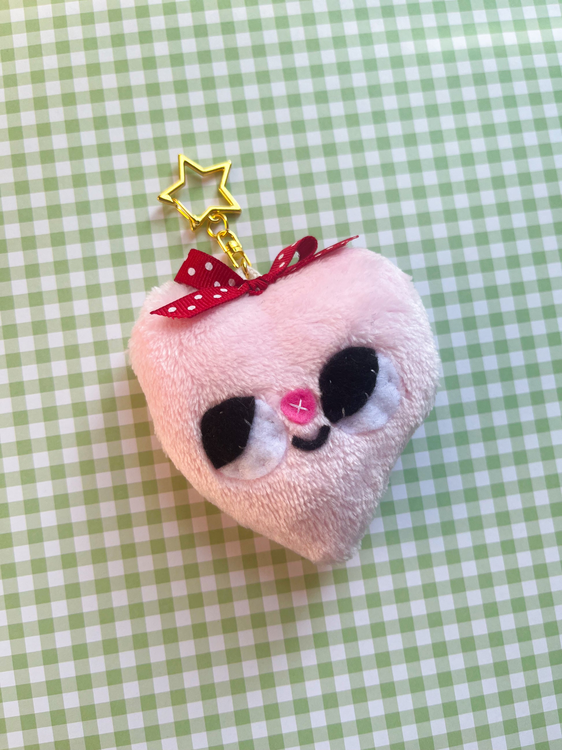 made with minky faux fur, felt, and thread. stuffed with polyfill and keychain hardware attached with twine