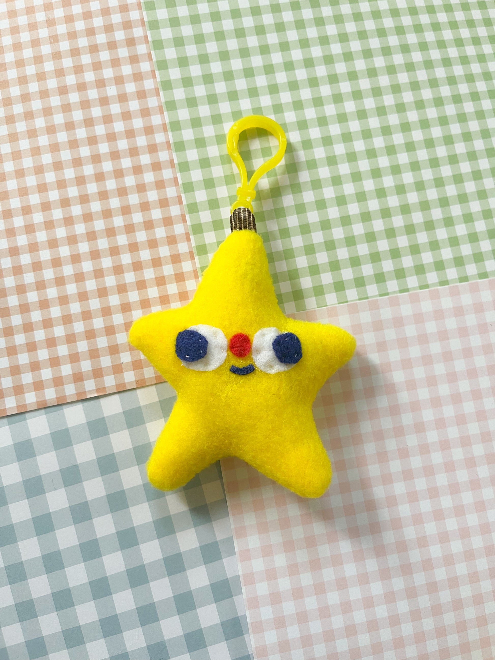 made with yellow anti-pill fleece, felt, and thread. stuffed with polyfill and keychain hardware attached with ribbon