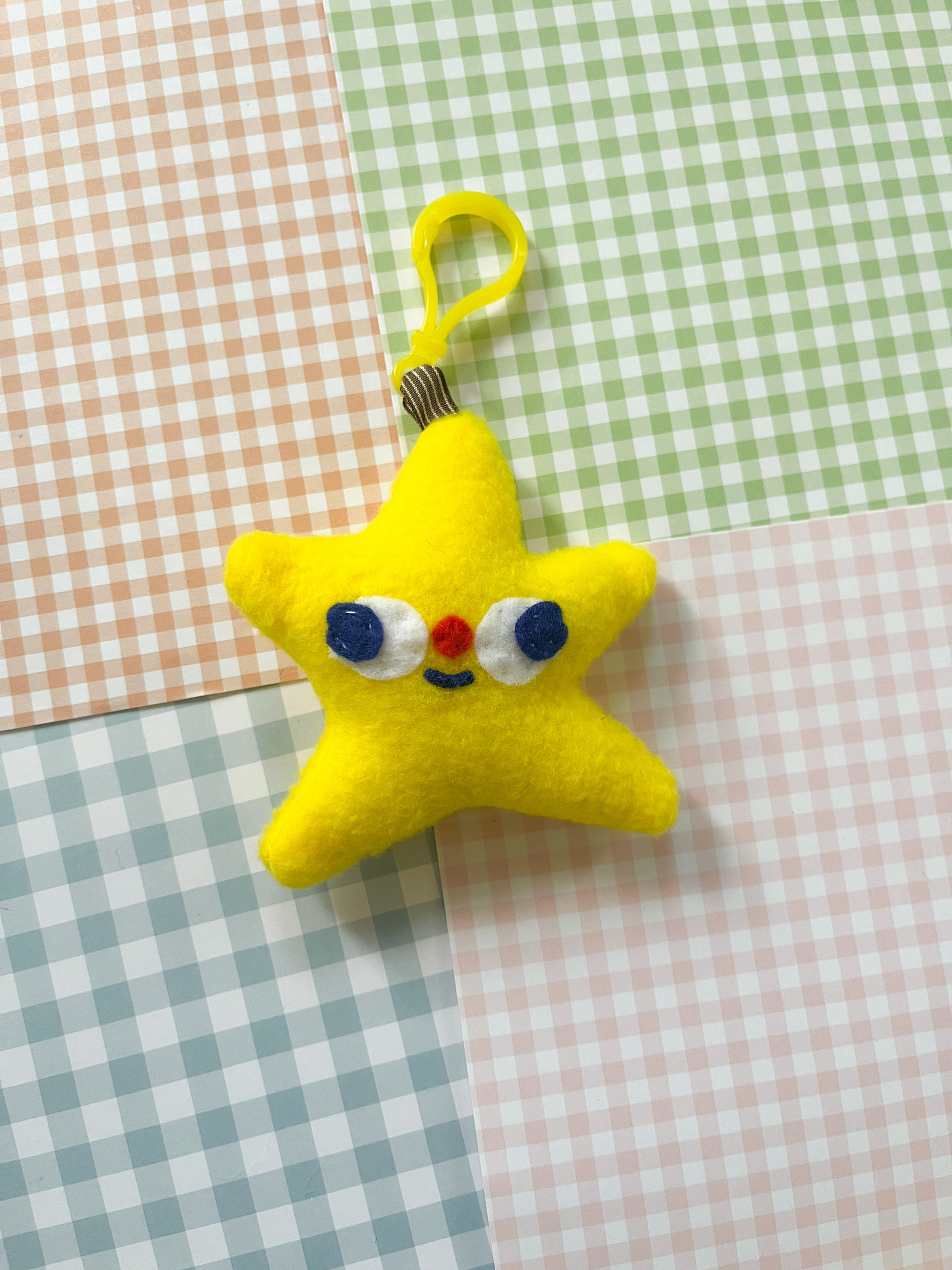 made with yellow anti-pill fleece, felt, and thread. stuffed with polyfill and keychain hardware attached with ribbon